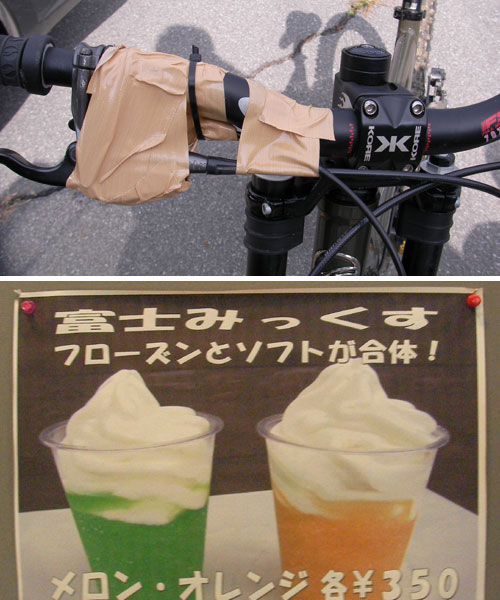 仕方ないので一本目は無理無理下って帰ってきてから666さん得意のガムテで固定。すごいぞ、ガムテープ。こいつで固定できないものはない!(笑)めちゃくちゃ男気あふれる外観です。ライドの写真を取れるほどテンションは回復しませんでしたが、なんとかこの日はこれで凌げました。結局超~まったりモードで5本で終了。一人ブラックなオーラを出しマックっていましたがお付き合いいただきありがとうございました。次回もご一緒お願いいたします。