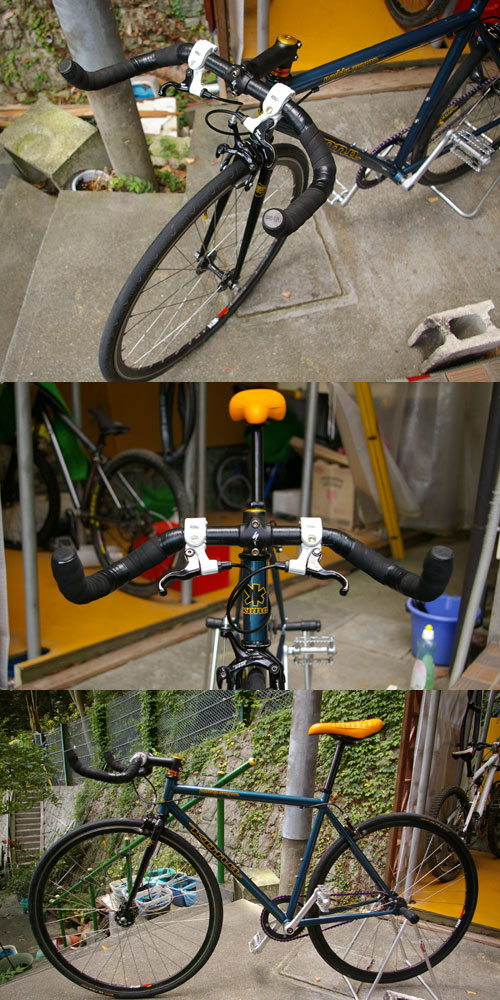 すんごく疲れます、このポジション。(笑)とりあえずステムは仮、バーテープも使い古しを使ったのでイマイチ綺麗に巻けませんでしたので、もうちょっと手入れする予定。